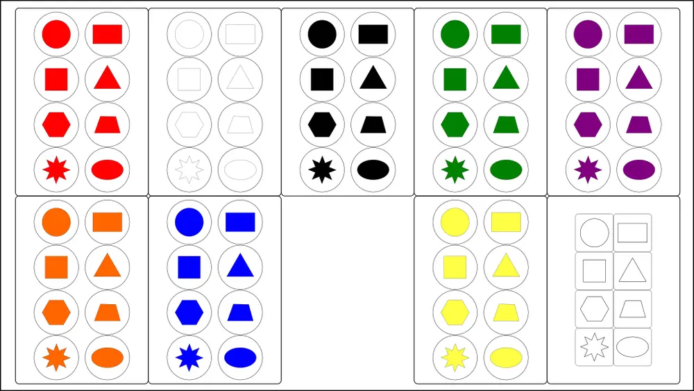 Každá z 8 barev je zastoupena 8 geometrickými tvary.