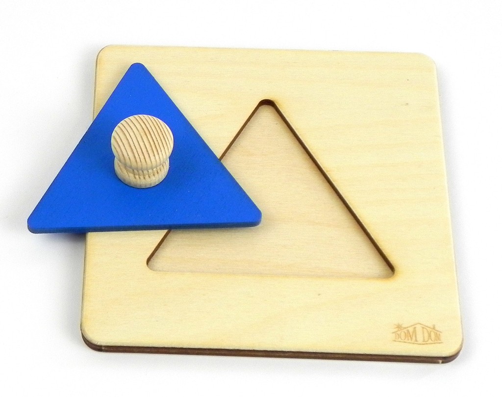 Může se zdát až příliš jednoduchá, ale o to právě jde – dítě se soustředí na jedinou činnost, neruší ho žádné doplňky nebo „vylepšení“. Když trojúhelník (i čtverec) snadno zvádá, může se přejít ke vkládání třech tvarů.