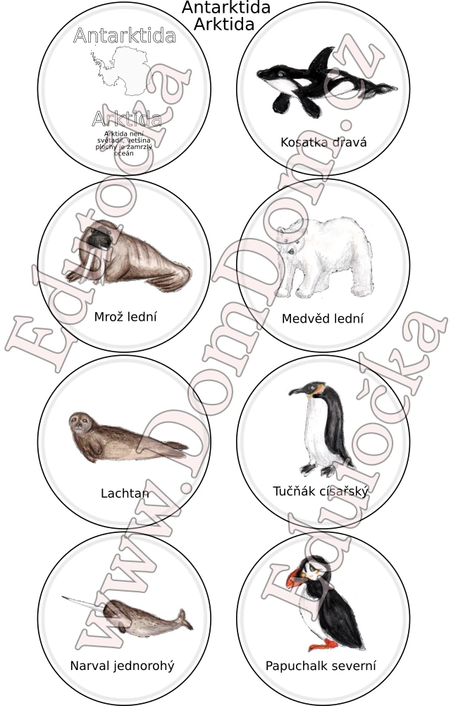 Sedm koleček s obrázky zvířat mají děti přiřazovat k obrázku s názvem kontinentu, na kterém vyobrazený druh žije. Nejlépe se skládají do vzdělávacího doplňku Edutočka na Kolotočce, ale dají se použít i jakkoliv jinak.